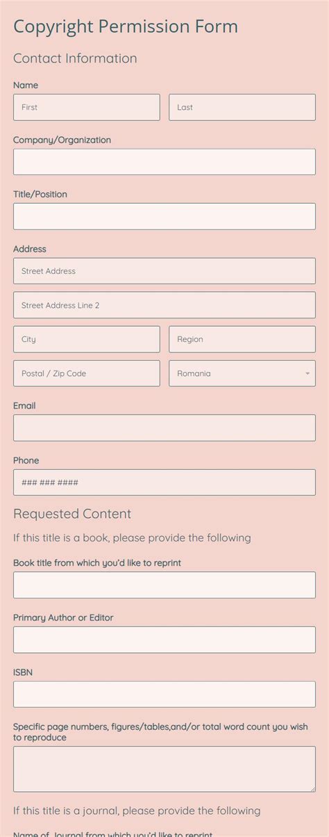 Embed link on your website to collect copyright request with formplus simple online form builder. Keep a record model permission letters step 1: Contact the copyright owner step 2: A copyright permissions sample letter is below. Cable statement of account forms. Web this copyright permission form template creates a simple solution for setting up permission requests for use of materials or articles that are under intellectual property protection. Your first step is to determine if you need permission in order to use a work. No matter how you obtain copyright permission, it's best to have a written document as evidence of the permission obtained. Creative commons library's digital collections & copyright finding & using visual materials attribution and notices copyright claims board (ccb) more sample forms Web once you determine that obtaining permission to use a copyrighted work is warranted, the first step is to research its copyright status.1 consult the location on a work or its packaging that displays a copyright notice (such as the copyright page of. Embed link on your website to collect copyright request with formplus simple online form builder.