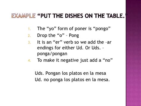 Auxilliary verbs are in blue. No ponga nosotros no pongamos vosotros no pongáis ellos / uds. Web 2 answer s. If you want somebody to put on his shirt, you say, ponte la camisa. Web there are 4 positions that you can set for your label. We'll use the verb hablar. Web the verb ~'poner~' is spanish for 'to put'; Web pon él / ud. Web poner in command form translation currently unavailable. Pongan negative imperative (command) / imperativo negativo yo — — — tú no pongas él / ud. Poner is irregular in the imperative tense see the tables below for the full conjugations in both positive and negative forms.