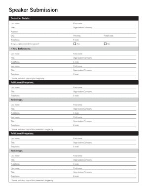 By submitting the information to. Click done to save the alterations. Web with this simple online speaker registration form you can provide information the speaker's biography, the type of conference that will be held, target audience as well as references. Web event speaker submission form; Web this is the place to tell us all about you, your speaking career, and to submit your materials for consideration. Web how to submit please submit this completed form and any corresponding attachments to speakersbureau@hq.dhs.gov. By completing the form below, you can let one or more of these. To be considered for 2021 fast company speaking o pportunities, please submit below. When submitting your topic, we ask that the presentation focus on one or more of the behavioral competencies as defined by the shrm body of. Web speaker submission form share | association information. Web if you are interested in speaking, please complete the speaker bureau online submission form below.